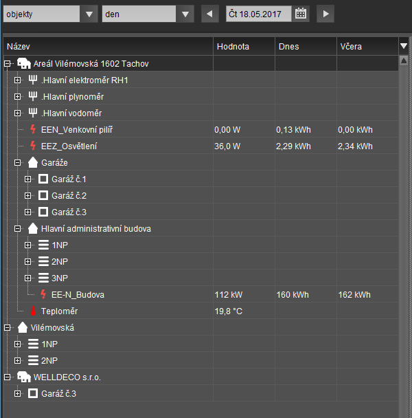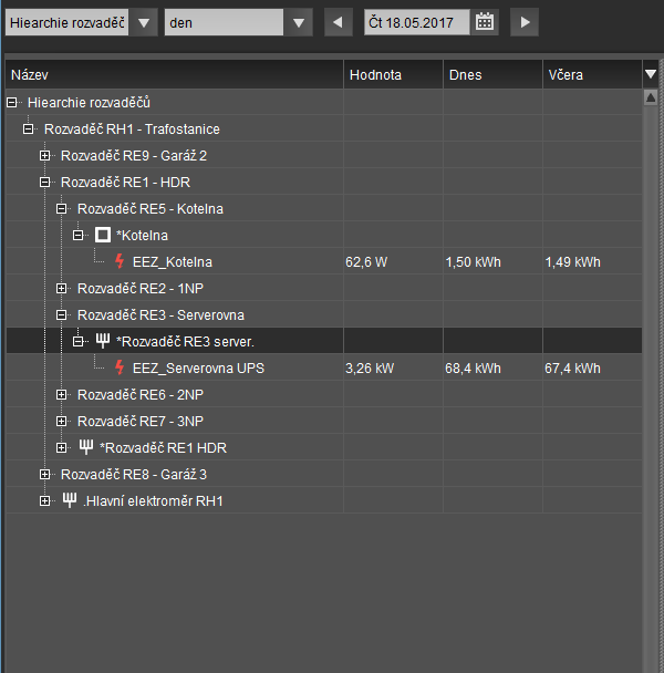 Tento pohled zobrazuje stromovou strukturu dle propojení jednotlivých měřených míst. Např. např měření elektrické spotřeby místnosti bude ve stromu umístěno pod rozvaděčem daného patra a ten pod rozvaděčem budovy.